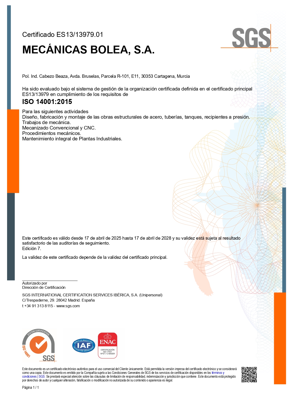 Para lograr estos objetivos, MECÁNICAS BOLEA dispone de un Sistema de Gestión de Medio Ambiente basado en la norma ISO 14000 y se compromete a proporcionar un entorno de trabajo seguro y saludable para todo el personal.